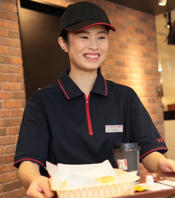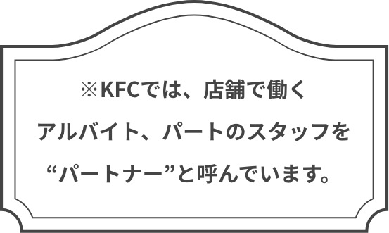 店舗で働く20名、30名といったパートナーを育成し、調理法を伝え、人の手を通して「おいしさ」を伝授していくということになります。チキンの調理担当者は、「チキンスペシャリスト」というKFC独自の認定資格の取得が義務づけられています。それに加え、一人ひとりの想いが大切になります。だからこそ、パートナーのモチベーションを高め、仕事の面白さを伝えていくのも社員の仕事。店舗という一つの組織を、お客さまの期待に応えられるチームへと変えていくのは、店長や副店長の手腕。だからこそ、一人ひとりの人と向き合う力が試されるのです。