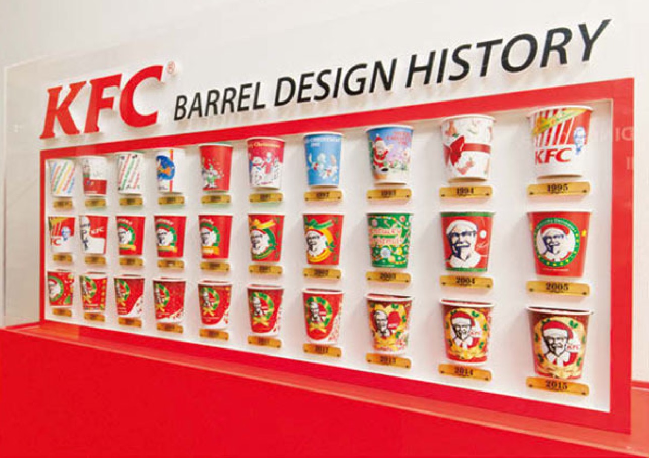 こうしてクリスマスのメニューにフライドチキンが定着したころ、パーティバーレル(オリジナルチキン、サラダ、アイス、絵皿)が誕生します。冷たいものと温かいものを1つのパッケージに詰めるなんて、当時は前例のないこと。新しいスタイルを生み出す挑戦は、苦難の連続でした。