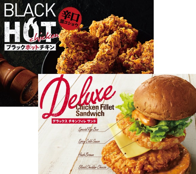 基幹商品のオリジナルチキンを食べてもらうことに加え、来店するお客さまを飽きさせないように、季節ごとに新商品を導入し、1年を通じてワクワクをお届けする努力も続けています。夏場の定番となったレッドホットチキン、意外性が話題となった辛口ハニーチキン、ピリピリとした刺激的な辛みがやみつきになるブラックホットチキンなどでチキンの新しい味を提案しています。デラックスチキンフィレサンドやクリーミーコロッケフィレサンドなどのボリュームのあるサンド、チョコパイなどのデザートメニューも強化しています。色々な機会で、様々な年齢層のお客さまにワクワクをお届けできるように、KFCらしい高品質で驚きのある商品づくりに取り組んでいます。