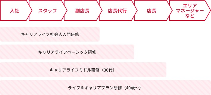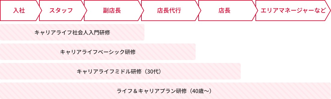 全世界共通の研修システムです。1年目は店舗運営の基本やホスピタリティ等を学び、2年目以降は、副店長の仕事(シフト作成、パートナー育成・面接等)、店長代行や店長の仕事(売上管理、仕入れ、店舗全体のマネジメントなど)を段階的に習得します。